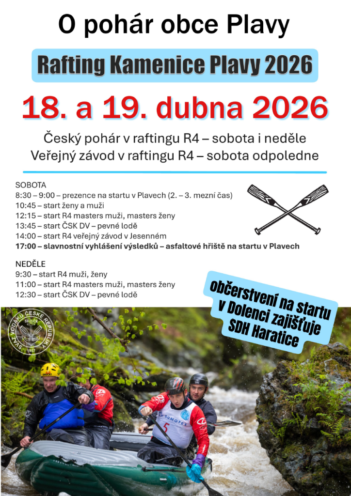 V Plavech se ve dnech 18. a 19. dubna 2026 uskuteční Český pohár v raftingu R4. Závody začnou v sobotu prezencí od 8:30 do 9:00, následovat budou starty v různých kategoriích včetně mužů, žen a masters. V neděli se závody opět rozběhnou od 9:30. Slavnostní vyhlášení výsledků proběhne v sobotu od 17:00 na asfaltovém hřišti v Plavech. Těšíme se na hojnou účast a skvělou atmosféru.