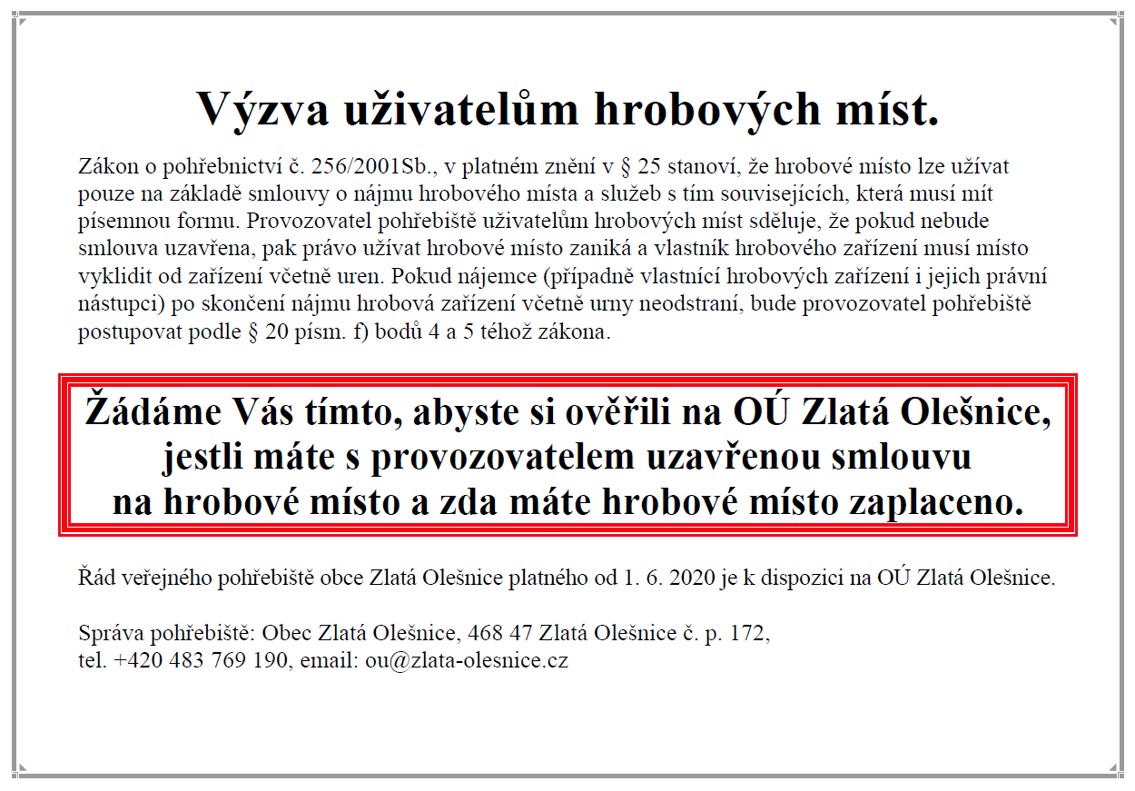 Většina smluv k hrobovým místům končí 31. 12. 2025. Vyhlašujeme proto výzvu pro všechny uživatele hrobových míst aby prověřili  stávající smlouvy a v případě potřeby uzavřeli smlouvy nové. V nových smlouvách by mělo být jasně uvedeno, kdo bude pokračovat v užívání hrobového místa, aby se předešlo případným nedorozuměním.